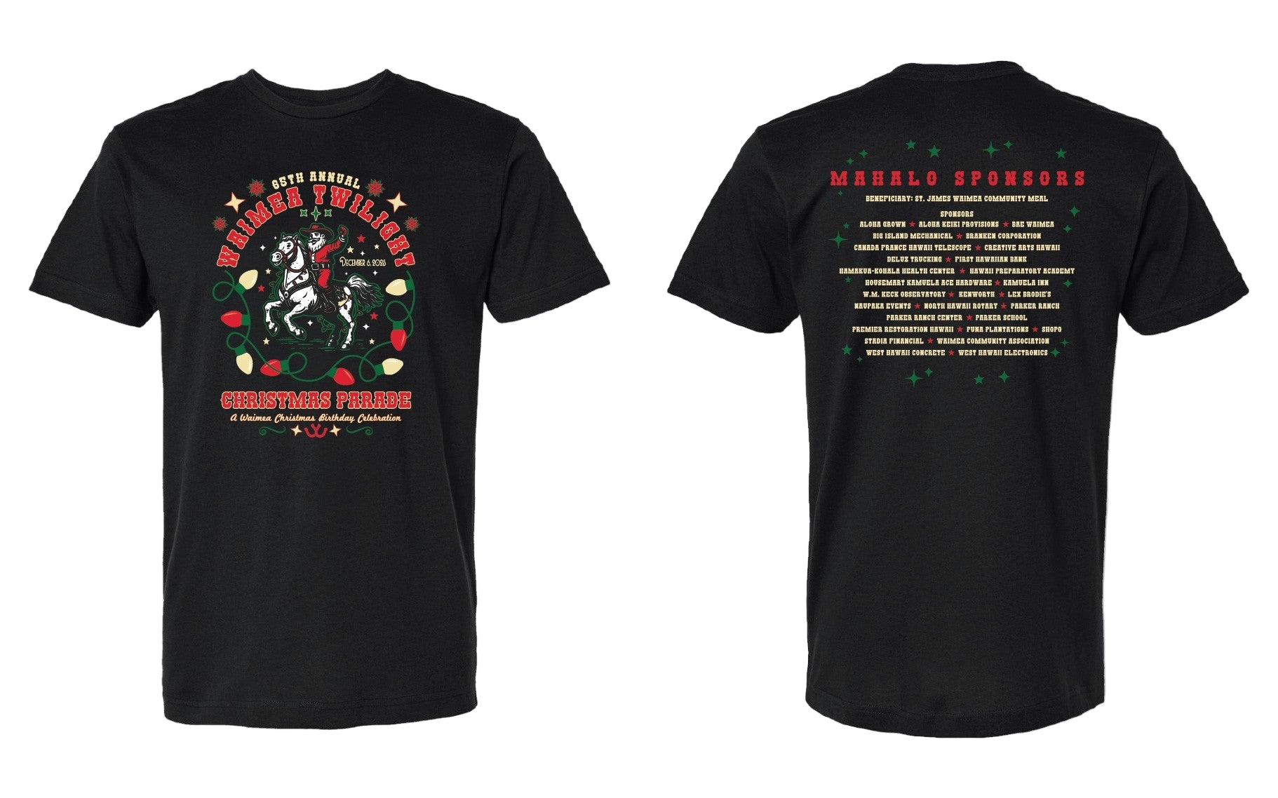 Celebrate one of Waimea’s most beloved traditions with the official 65th Annual Waimea Twilight Christmas Parade T-Shirt! This limited-edition tee features festive artwork honoring the parade’s “Waimea Christmas Birthday Celebration,” complete with holiday lights, stars, and a classic paniolo riding proudly at the center.